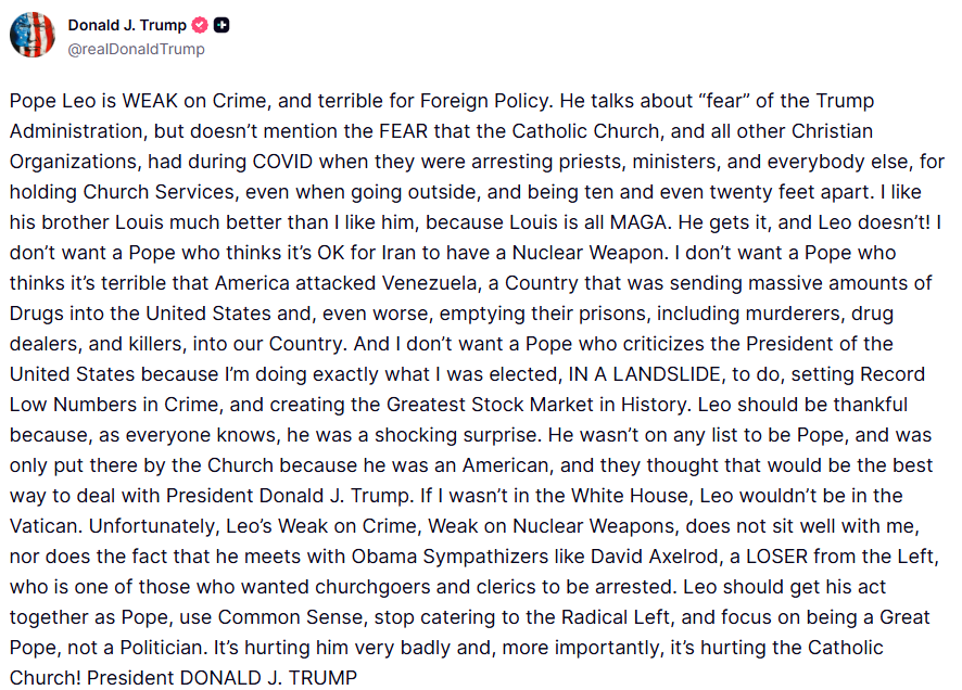 Last week, Trump had a similar crash out against former “MAGA allies” including Tucker Carlson, Candace Owens, and Megyn Kelly on Truth, calling them “low IQ” because they did not support the Iran War and have been extremely vocal in their opposition against the conflict. This lash out against Pope Leo is not the first time that Trump has attacked a pope on social media. Prior to Trump’s election in 2016, in response to comments that Pope Francis had made on Trump’s proposed border policy and plans to build a wall, Trump responded to the Pope on social media stating that he should wish he was elected president due to his plans to combat ISIS before it could attack the Vatican. After Trump was elected, Pope Francis continued to criticize Trump’s immigration and border policy, and Trump once spoke back against him, calling him “disgraceful” for questioning his Christianity. However, in comparison to the recent escalations between the Holy See and Vatican State, the latest social media post is the first time that Trump has specifically attacked a pope in such a way as pressures mount over the Iran War, Strait of Hormuz crisis, and the ripple effects on the global economy as energy prices skyrocket.